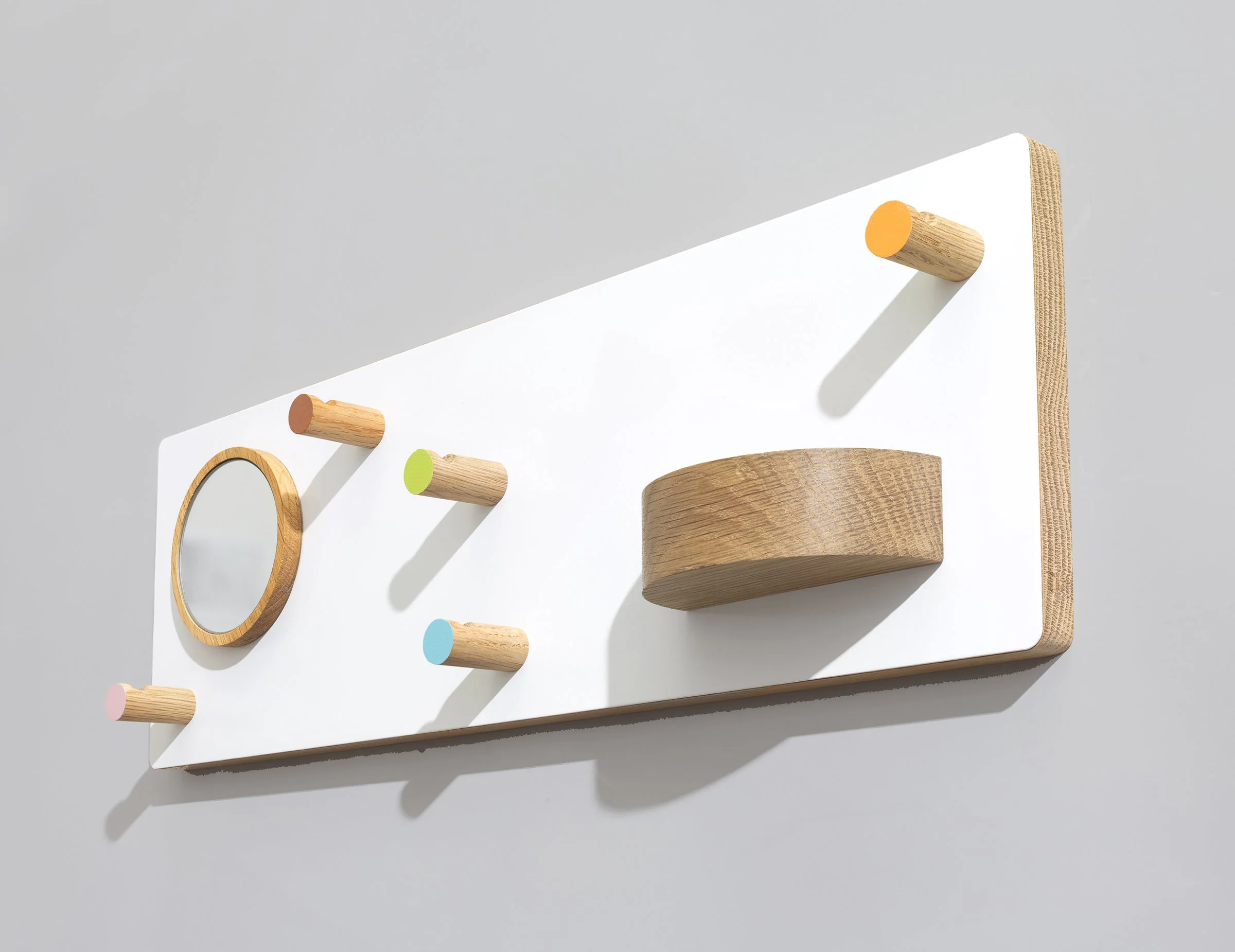 An entryway organizer in oak and powder-coated steel, with various accessories.
